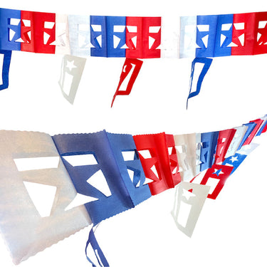 Cada pieza de la guirnalda está troquelada con la silueta de nuestra bandera, en colores blanco, azul y rojo, dándole un toque distintivo, elegante y patriota a tu decoración.