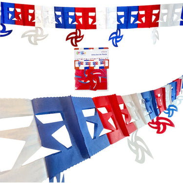 Con formas espirales que cuelgan, esta guirnalda aporta un efecto visual llamativo en rojo, blanco y azul, los colores de nuestra bandera.