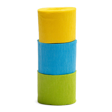 Decora tu celebración con este festón de papel crepé en tonos vibrantes. Su mezcla de amarillo alegre, celeste suave y verde lima fresco aporta color y dinamismo a cualquier espacio.