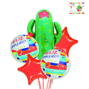El pack contiene un globo cactus 76cm, 4 globos mylar de 43x53 cm, varillas para inflar con aire o helio y una cinta