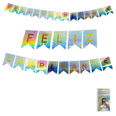 Guirnalda Feliz Cumpleaños holográfica color plateada.